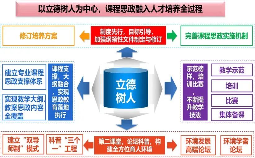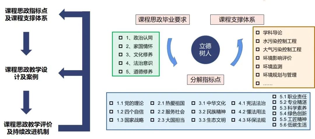 基于立德树人目标制定政治认同、家国情怀、文化修养、法治意识和道德修养五个课程思政的毕业要求,分别由各专业课程进行支撑,明确各门专业课程要达成的目标任务,将课程思政融入人才培养全过程,建立了环境工程专业课程思政指标点及可复制推广的课程支撑体系,形成了环境类专业课程思政案例库及行之有效的课程思政评价机制,解决了课程思政落地执行难、教学指导案例及效果评价机制缺乏的问题,实现从“实行”到“实效”的质量转变。