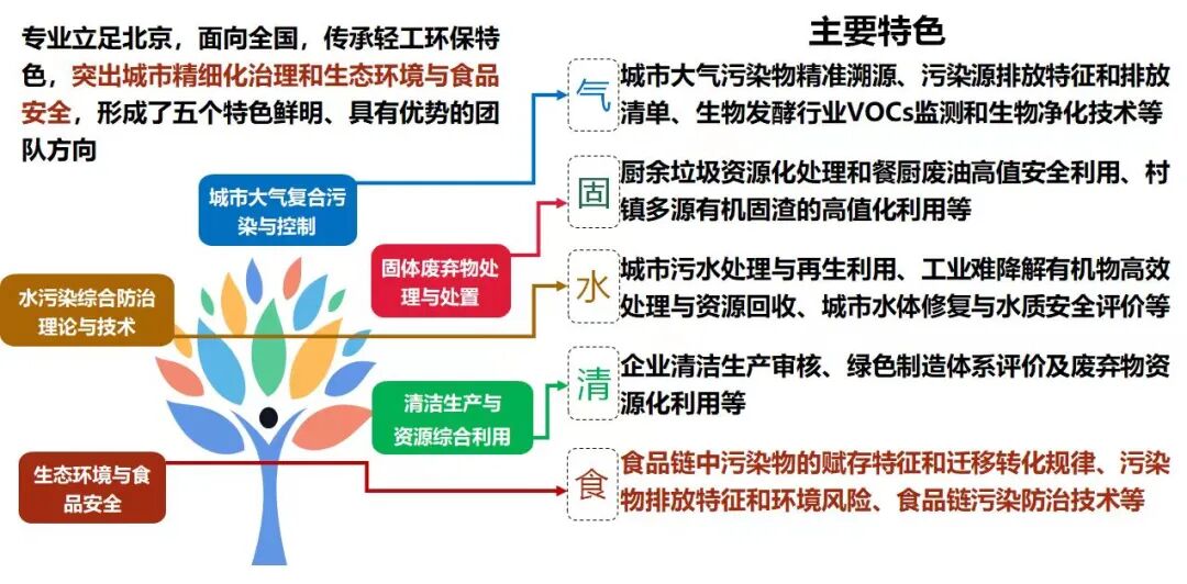 本专业致力服务环保行业可持续发展,积极承担国家/行业标准制定,深入企业开展评价服务,走进社区参与生态文明科普。城乡有机固废高值安全利用的理论创新和技术研发及应用,在餐厨废油资源回收、有机固废资源化处理、污水治理等领域牵头制定国家标准 2 项、行业/团休标准7顶,其中,主持发布《餐废油资源回收和深加工技术要求》(GB/T 40133-2021)和《城市园林废弃物资源回收和深加工技术要求》(GB/T 40199-2021)国家标准2项,发布《调味品、发酵制品制造工业污染防治可行技术指南》(H)1303-2023)国家生态环境标准1项;拥有国家清洁生产审核师 11 人,为轻工食品等行业25 家企业提供清洁生产技术咨询、绿色工厂评估及绿色产品评价服务,有效推动提升了行业绿色低碳发展水平。近年来主办/承办行业会议26 次,参加国内外会议 48 人次,举办环境发展高端论坛和环境学者论坛共4期。与首都师大二附中开展的科普科创双融双促助“双减”项目,相关报道入选“学习强国”,播放量超过 4 万次,获生态环境部“我是生态环境讲解员”优秀组织单位。
