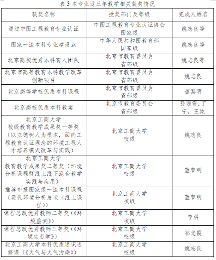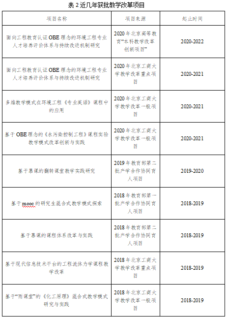 近5年,本专业共承担教育教学改革研究项目14项,其中教育部高等教育司产学合作协同育人项目4项,校级重点项目3项,受邀出席教学改革研讨会并做主题报告4人次,2人次获校级课程思政优秀教师奖。2021年获评“北京市高校优秀本科育人团队”和本校教育教学成果一等奖。《固体废弃物处理处置工程》获得obao欧宝娱乐 网络优质课程建设资助,《人类与环境》和《大气与大气污染》获得obao欧宝娱乐 优质通识选修课项目资助。本专业教师出版著作/教材、发表教改论文等代表性教学研究成果14项。近5年,本专业教师或校级/院级教学竞赛奖24项。