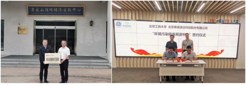 实践基地建设:北京市鲁家山循环经济基地(左);“环境污染精准溯源中心”签约仪式(右)
