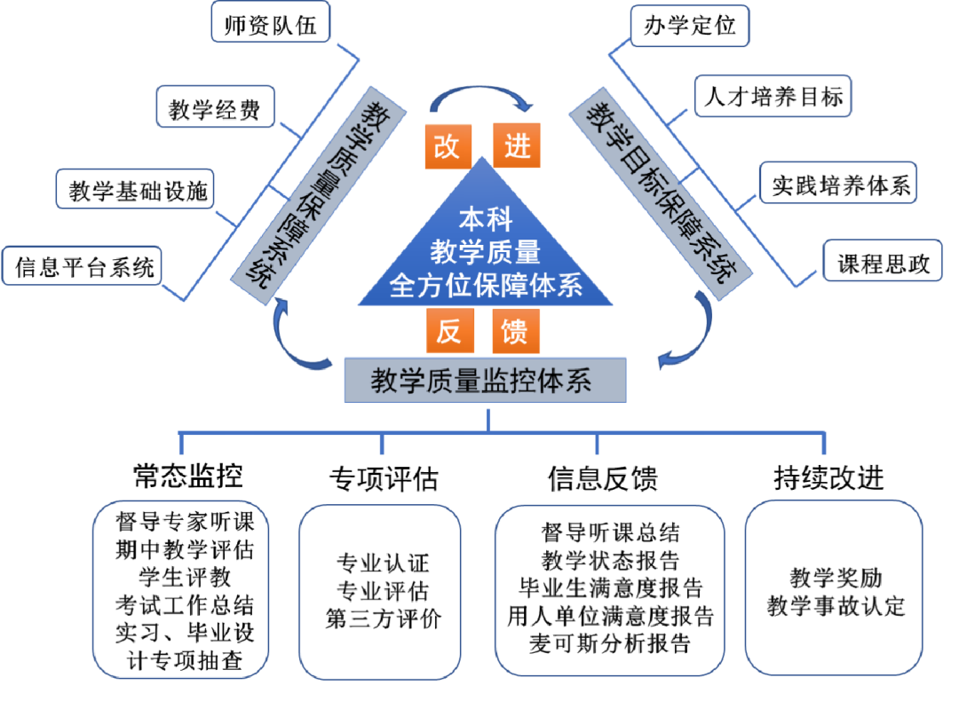 加强制度建设,构建专业培养目标达成度、毕业要求达成度、课程目标达成度评价等多项制度,严把出口关。每学期对教学过程进行监督检查,针对课程教学过程中的教学大纲导向、教学过程中形成性评价、课程目标与教学内容匹配等方面进行检查,实现了对本专业教学过程各教学环节的监控、管理、评价、反馈、改进,不断提升本专业的教学质量水平。同时落实学生、督导和同行结合的教学质量监控,形成完善的教学质量监控与保障体系。